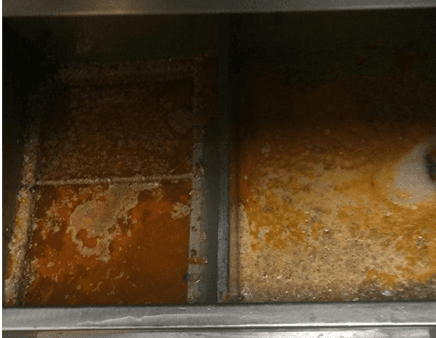Timeline: Day 1 At the start of the trial, the grease trap was heavily compromised by a thick, solidified layer of fats, oils, and grease (FOG). This level of buildup typically causes slow drainage, foul odors, and significant risk of pipe blockages.